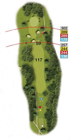 “A classic short hole. The fairway slopes from left to right, the approach shot to the green, which slopes front to back, must be well placed to leave a good two putt.”